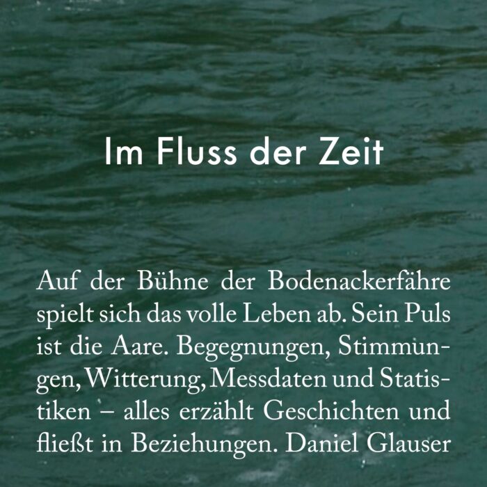 Auf der Fähre fallen alle Funktionen – ob Kapitän, Steuermann, Offizier, Koch, Mechaniker, Matrosin oder Gehilfe – auf ein und dieselbe Person: den Fährmann. Begegnungen, Beobachtungen, Stimmungen, Witterung und Jahreszeiten, Messdaten und Statistiken – alles erzählt Geschichten, fliesst in Beziehungen und manchmal wird es still. Hier verlässt die Leserin, der Leser den Mikrokosmos der Fähre, untersucht ihr Verhältnis zur Welt, erforscht den Mythos des Fährmanns, oder taucht in die Legende der grünen Aare.